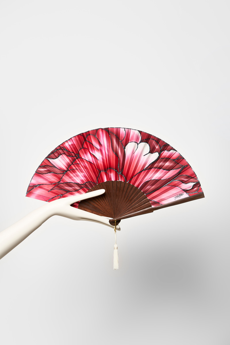 - Abanico de seda pintado a mano con flor en macro view scale con tonos rojos sobre fondo blanco.