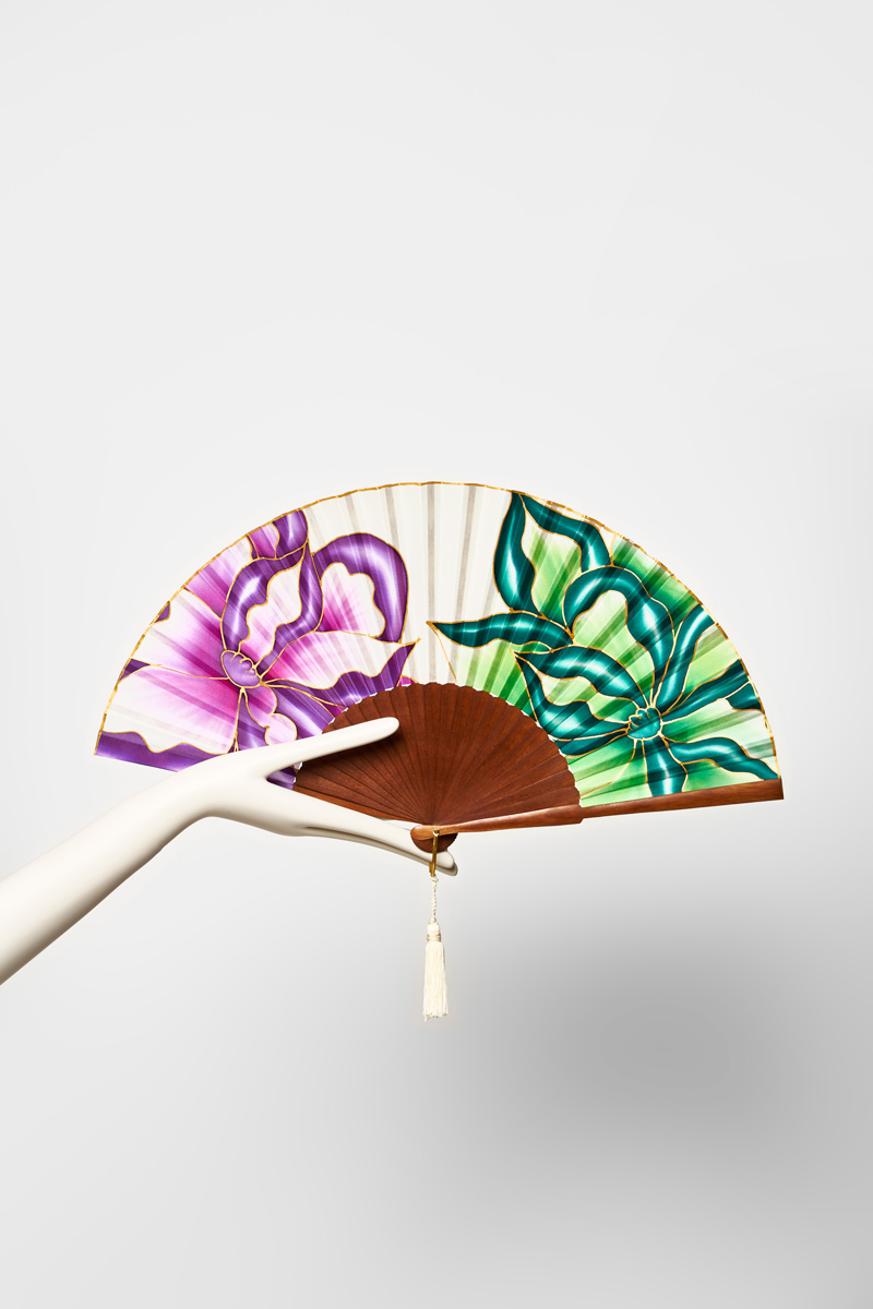 Abanico de 27 cm con flor morada y verde perteneciente a la colección Essence. Inspirada en la forma de ver la naturaleza de la artista Georgia O´Keefe. La flor se extiende como un fractal recordándonos que todo está vivo y en constante movimiento.