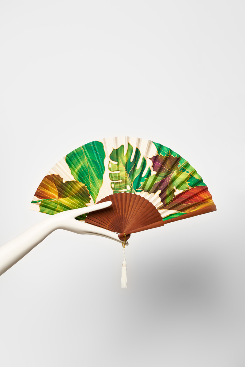 Abanico de 27 cm con hojas en tonos verdes y ocres sobre fondo blanco. Este abanico destaca por su alegría y movimiento. Perteneciente a la colección Natura, es todo un clásico.