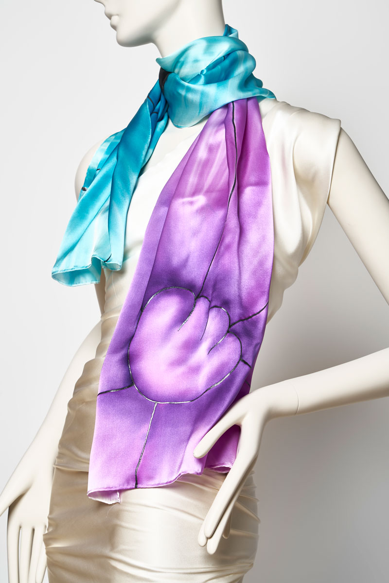 Fular pintado y orillado a mano que combina malva, azul y negro con fuerza y determinación. Atrévete con estos favorecedores tonos fríos.